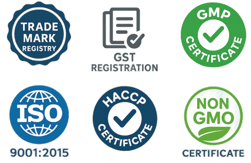 हमारी कंपनी गुणवत्ता और विश्वसनीयता को सर्वोच्च प्राथमिकता देती है। ग्राहक को सुरक्षित, शुद्ध और मानकीकृत उत्पाद प्रदान करने के लिए हमारी कंपनी निम्नलिखित राष्ट्रीय और अंतर्राष्ट्रीय प्रमाणपत्रों से प्रमाणित है: